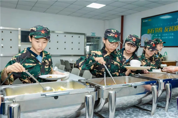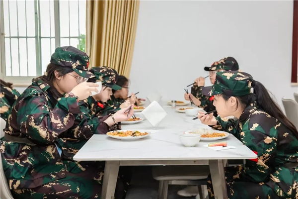 正午时分,身着迷彩的同学们有序排队取餐,大家围坐一桌,落座后安静就餐,为下午的活动积蓄着能量。