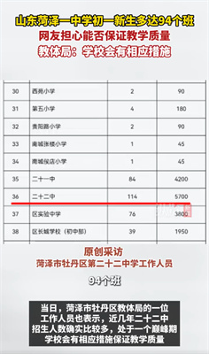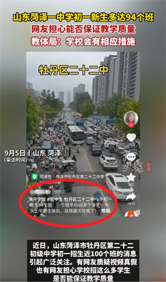 近日,山东菏泽市牡丹区第二十二初级中学初一招生近100个班的视频引起广泛关注。有网友质疑视频真假,也有网友担心学校招这么多学生是否能保证教学质量。9月5日,牡丹区第二十二初级中学的一位工作人员表示,该校今年新入学的初一年级确实有94个班。当日,菏泽市牡丹区教体局的一位工作人员也表示,近几年二十二中招生人数确实比较多,处于一个巅峰期,学校会有相应措施保证教学质量。