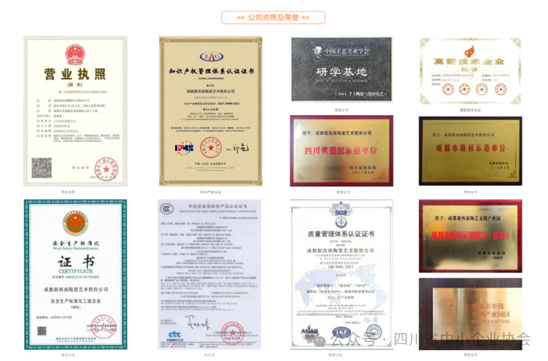 公司先后获评中国版权年度最具影响力企业、全国首家工业与文创研究中心等称号,2022年荣获“2022四川天府旅游名县特色旅游商品网络大赛”金奖、2023年原创陶艺作品《邛彩米罗》《邛彩珐琅曼陀罗》瓷砖系列获评中国工艺美术学会金奖、荣获2025中国文创圈最受欢迎的文创周边top 20荣誉,“驿路花开”荣获2025四川特色旅游商品大赛优秀文创城市礼物奖、2023.6月-2026年被评为成都市科普基地。