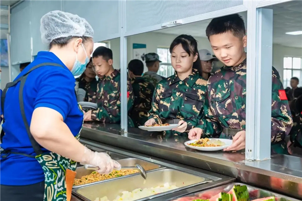 正午时分,身着迷彩的同学们有序排队取餐,大家围坐一桌,落座后安静就餐,为下午的活动积蓄着能量。