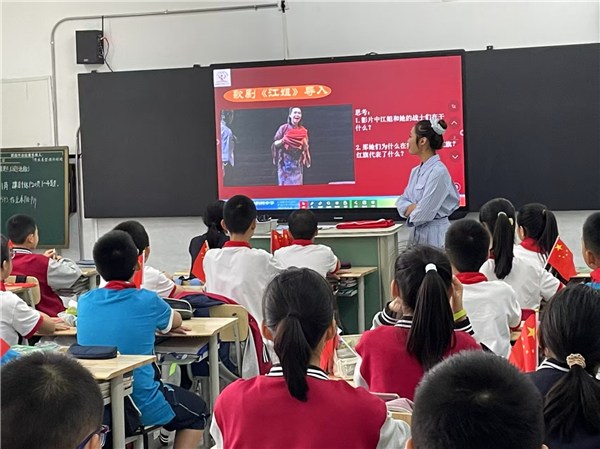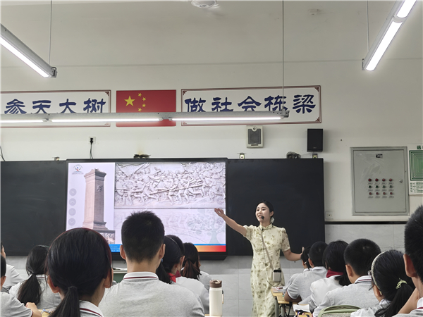 王菁婵老师展示七年级音乐欣赏课堂,通过《红旗颂》的情境再现与旋律线条分析,引导学生沉浸于乐曲构建的历史画卷,借助乐器音色辨识与主题旋律模唱,使学生在审美体验中感知音乐情感内涵,通过对比聆听与情感共鸣激发民族自豪感,实现革命精神的代代传承。