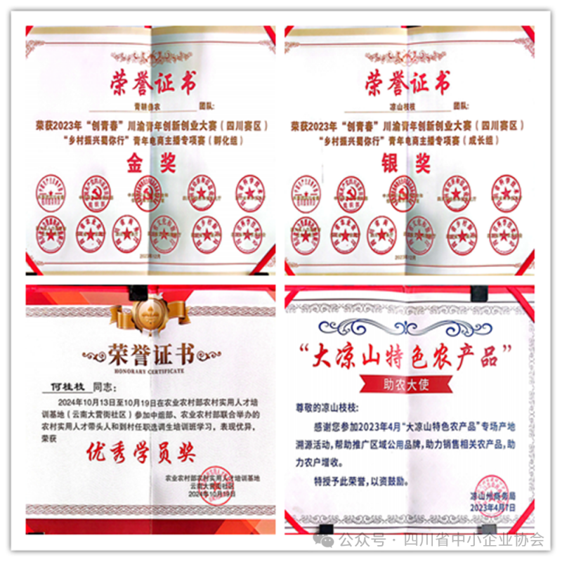 公司创始人先后荣获“创青春川渝青年创新创业大赛(四川赛区)青年电商主播专项赛”成长组银奖、孵化组金奖;“大凉山特色农产品”助农大使荣誉称号;凉山州电商直播协会凉山州助农大使;2024年在农业农村部农村实用人才培训基地荣获“优秀学员奖”;2025年四川省第五届“天府杯”创业大赛中荣获“十佳创业故事奖”等荣誉。